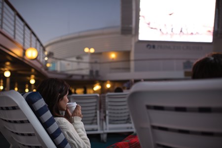 位於泳池畔的巨型銀幕,旅客可在躺椅上蓋著毛毯,伴隨免費爆谷與飲品,於星空下欣賞熱門電影及體育賽事