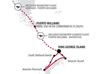 | Day 9 | 喬治王島離船。船公司安排航班返回威廉斯港, 智利,入住一晚船公司安排之酒店 King George Island – Disembarkation. Fly to Puerto Williams, Chile – Overnight accommodation nominated by Silversea Cruises |