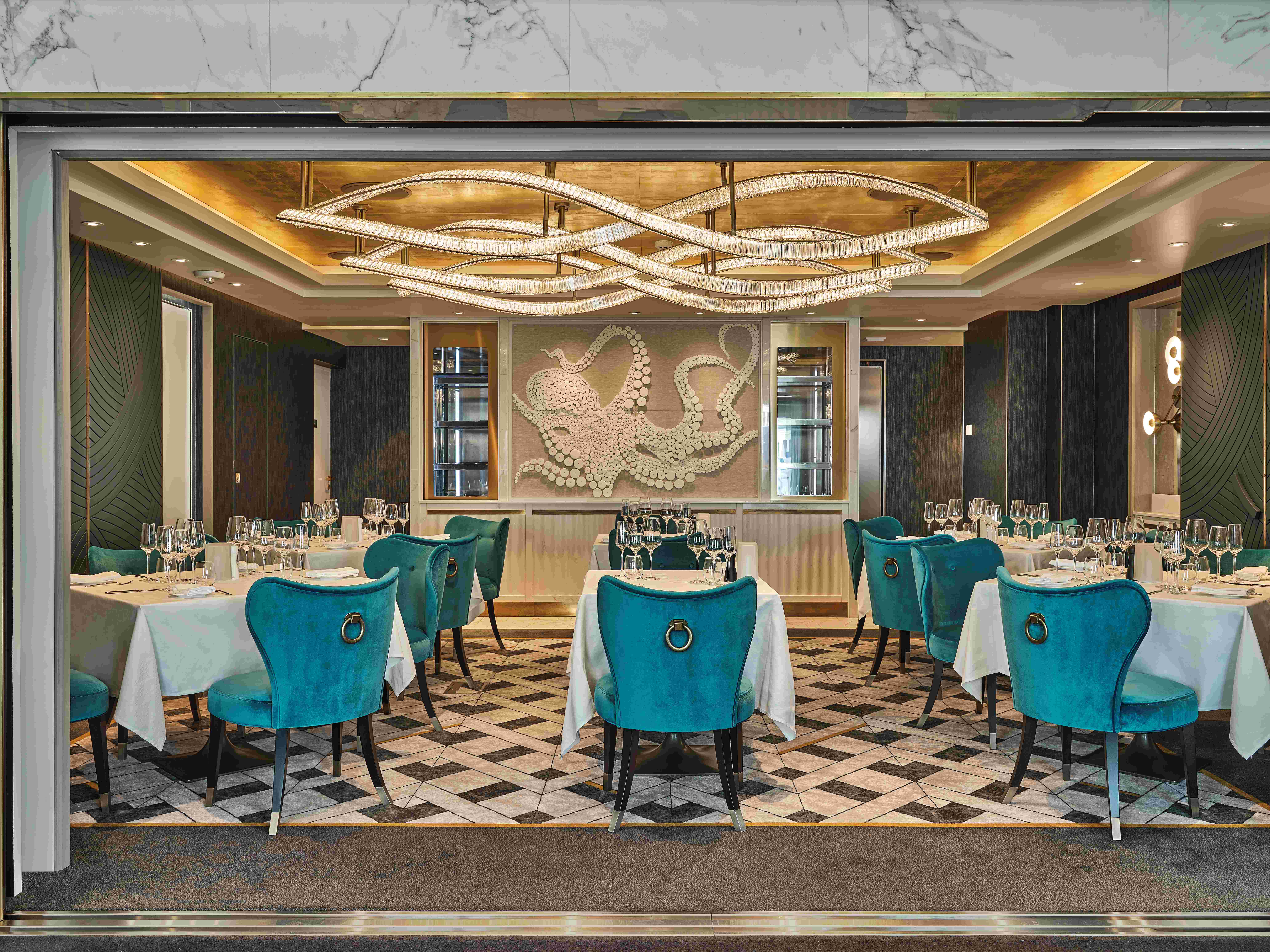 La Dame 為船上唯一收費餐廳,以法國傳統 haute cuisine 為靈感,提供多道式美酒配餐體驗。華麗環境與細緻服務,專為追求極致品味的饕客