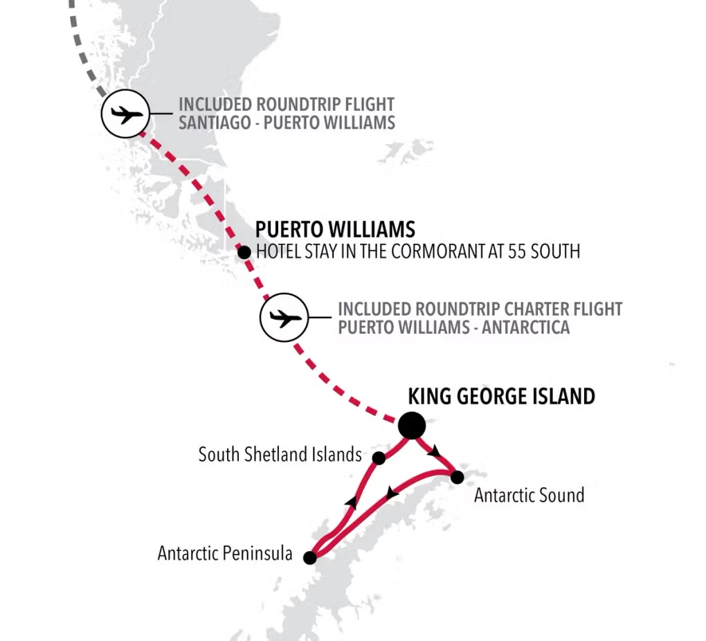 專機及安排 : 聖地牙哥至蓬塔阿雷納斯經濟客位專機 及 蓬塔阿雷納斯至喬治王島商務客位專機-尊享優先登機與舒適座位 │全程專車接送 : 登船及離船日全程機場,酒店及碼頭間接送