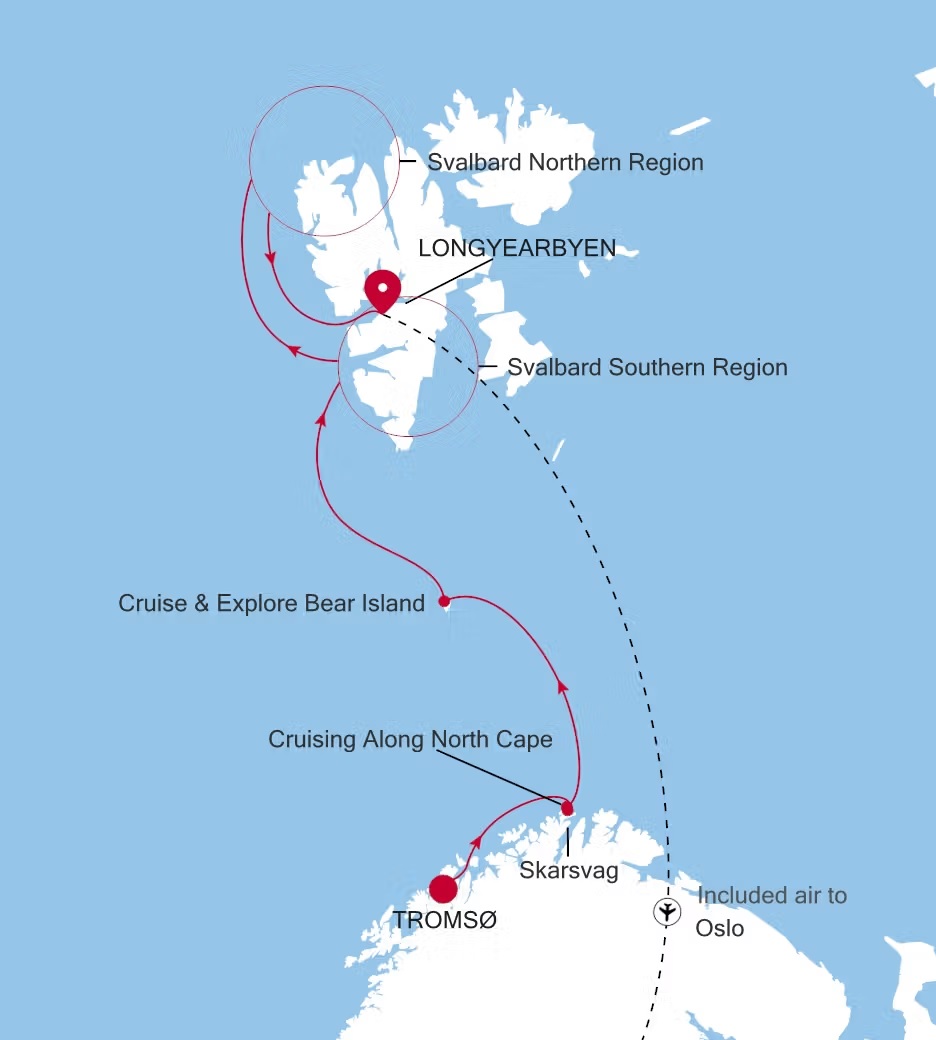 | 31 May - 02 Jun | Sun-Tue | 斯瓦爾巴南部 Svalbard Southern Region, Norway (船長及船員將配合天氣環境變化而彈性地安排遊輪的每日航程及活動) (Each day the Expedition Leader and Captain will determine the best course depending on weather, ice conditions.) |