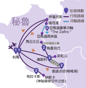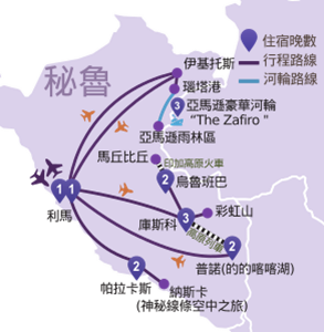 秘魯:利馬、伊基托斯、亞馬遜河、亞馬遜雨林、烏魯班巴、馬丘比丘、庫斯科、彩虹山、普諾(的的喀喀湖)、帕拉卡斯