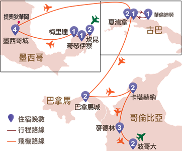 古巴:夏灣拿、奔納里奧、溫尼斯山谷、柯西瑪、華倫迪勞 | 巴拿馬︰巴拿馬城
