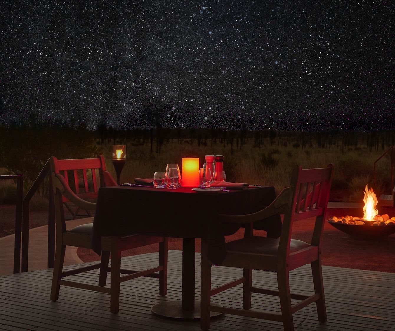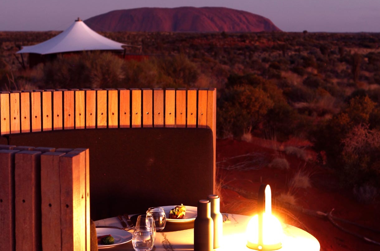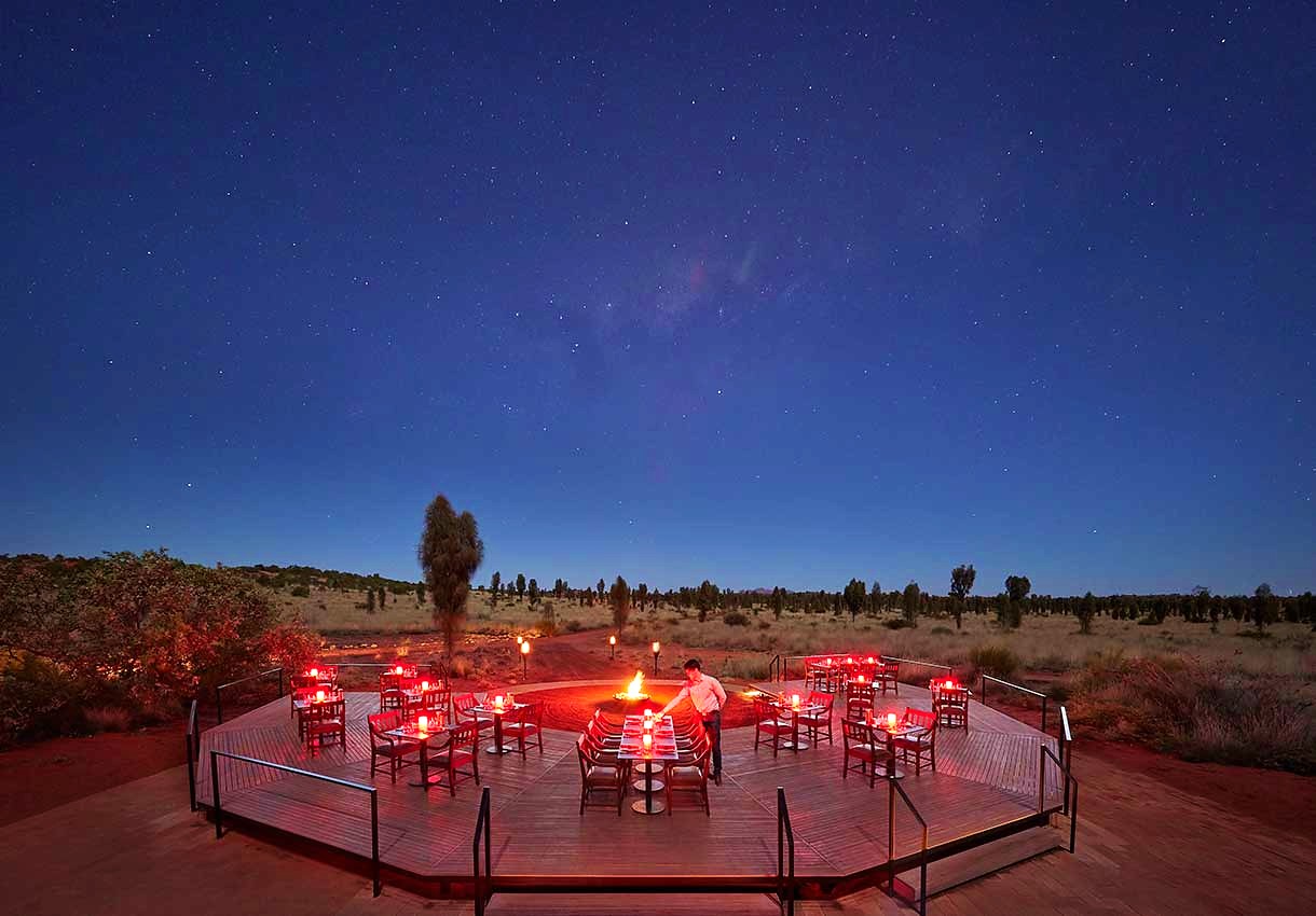 夜幕降臨,涼意襲來,Table 131°原野星光晚宴提供豐盛的四道菜晚餐及葡萄餐酒,在享用美酒佳餚的間隙抬頭仰望,聆聽導遊講述南半球夜空的傳說及紅土中心原住民的創世故事。