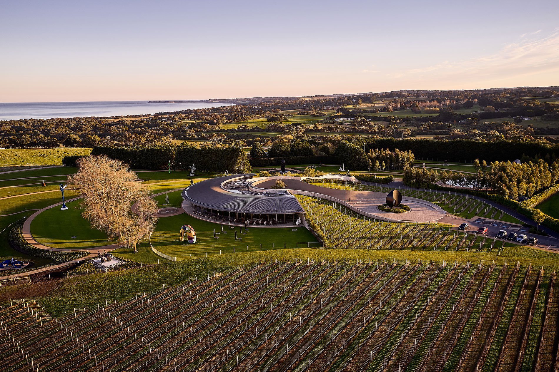 摩寧頓半島具代表性的藝術酒莊,莊園門口處是由墨爾本著名建築師Jolson設計的波浪形的混凝土結構,門前種有70多年樹齡的麵包樹更是由昆士蘭移植至此。進入莊園後,大片的落地窗可以看到一片片葡萄園和一覽無遺的海灣全景。團友可在優美的環境下享受優質午餐。