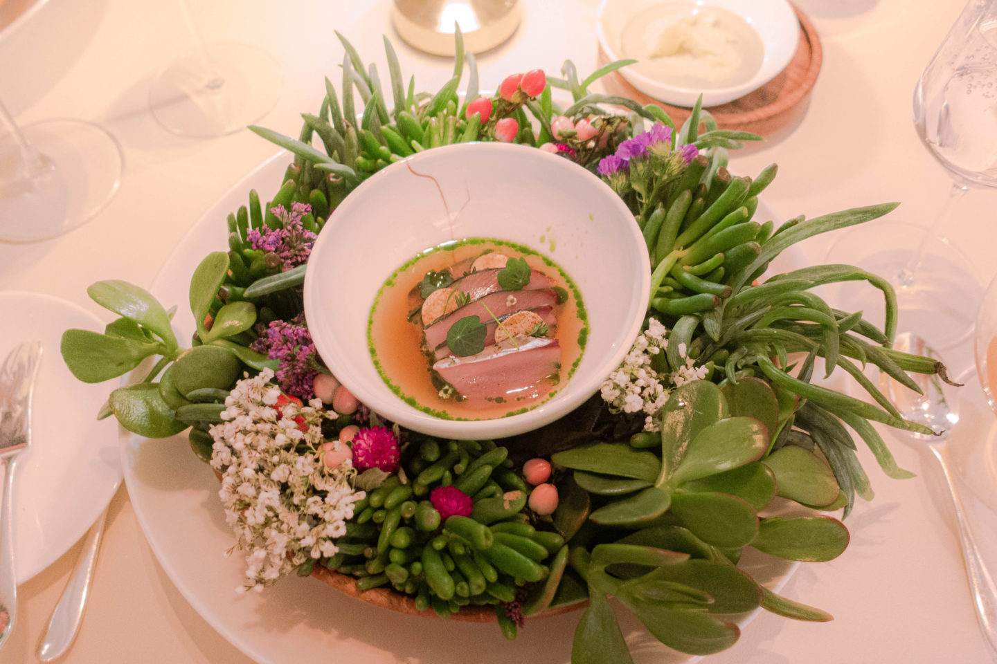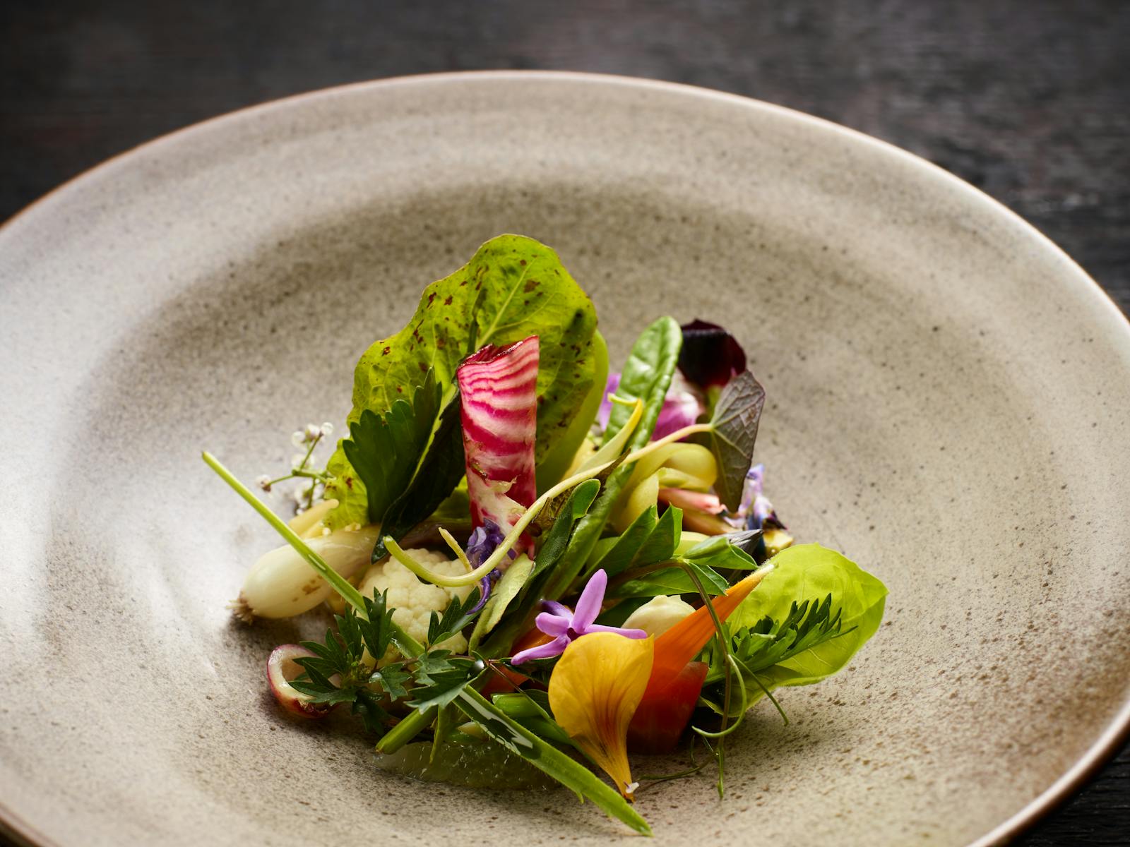 餐廳坐落於 30 英畝的農場之中,四周圍繞著自家耕作的有機農作物與果樹園,營造出與自然共生、低碳永續的餐飲氛圍。菜單以自家農場或周邊小農提供的季節食材為核心,九成以上蔬果都源自自家農田。主廚團隊每天花費大量時間親自採摘最新鮮的食材,因應每日收成調整菜單,呈現天然的多樣變化。