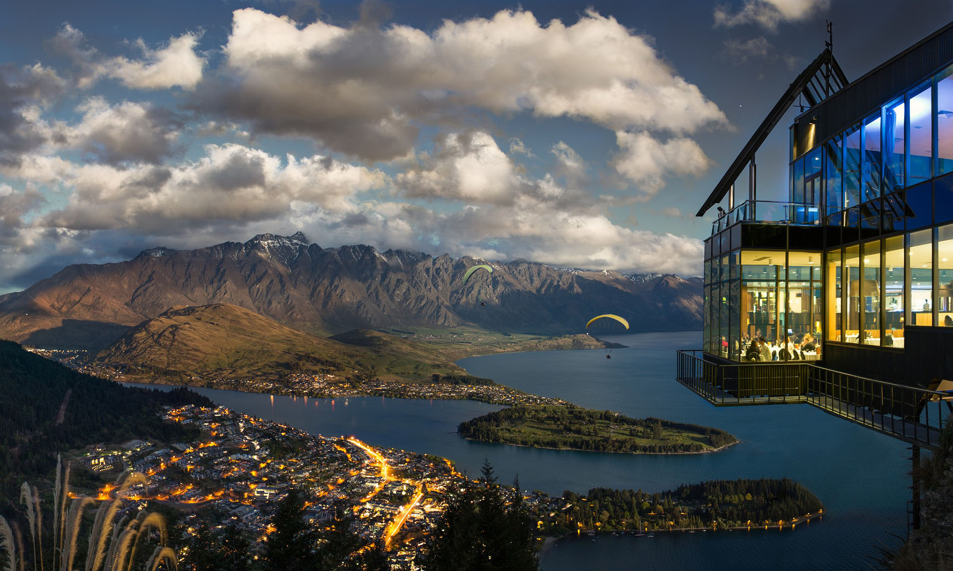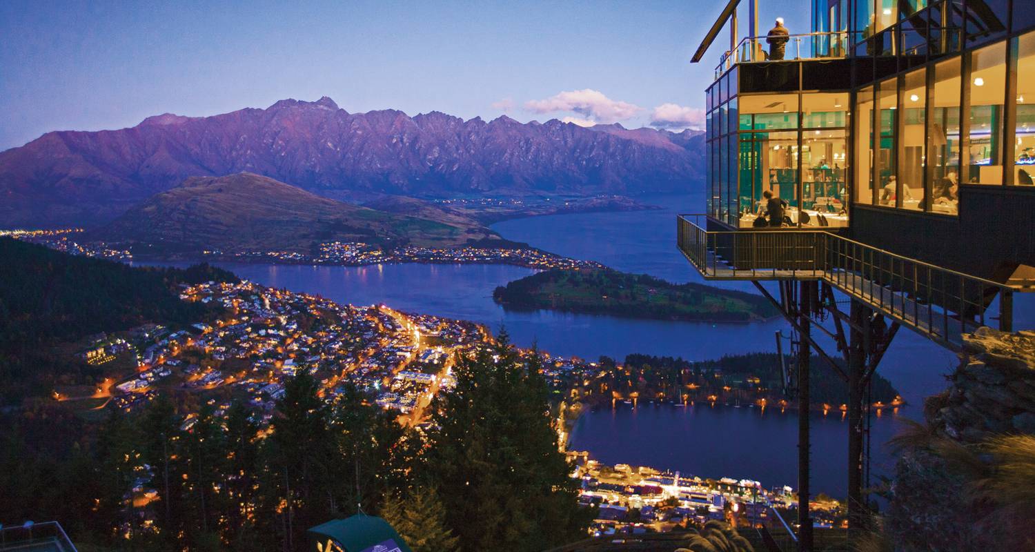 博士峰登山纜車:搭乘天際纜車前往600米高的博士峰山頂,沿途鳥瞰皇后鎮如畫風光,瓦卡蒂普湖美態盡入眼簾,並於著名觀景餐廳享用自助晚餐。