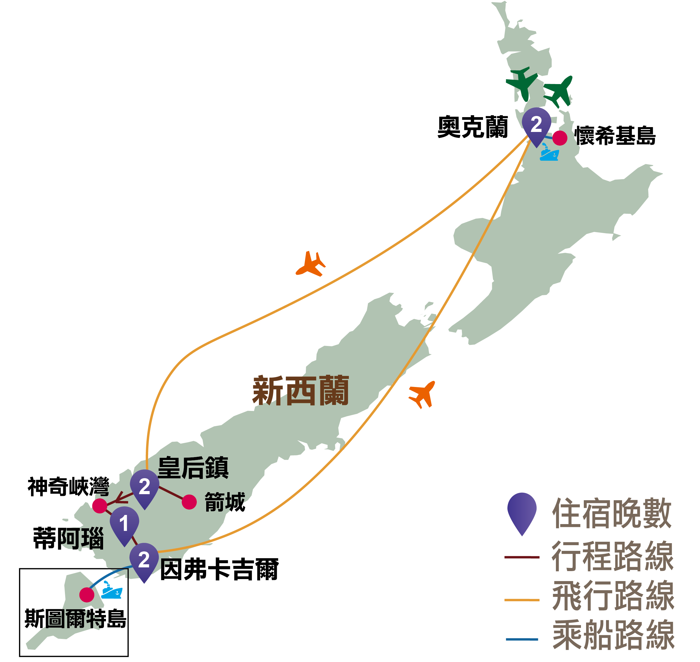 南島:皇后鎮、格萊諾基、箭城、馬納普里、神奇峽灣、蒂阿瑙、因弗卡吉爾、斯圖爾特島
