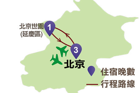 北京(故宮、居庸關長城、頤和園、天壇、天安門廣場、奧林匹克公園、首綱園、世園悅沁湯泉)