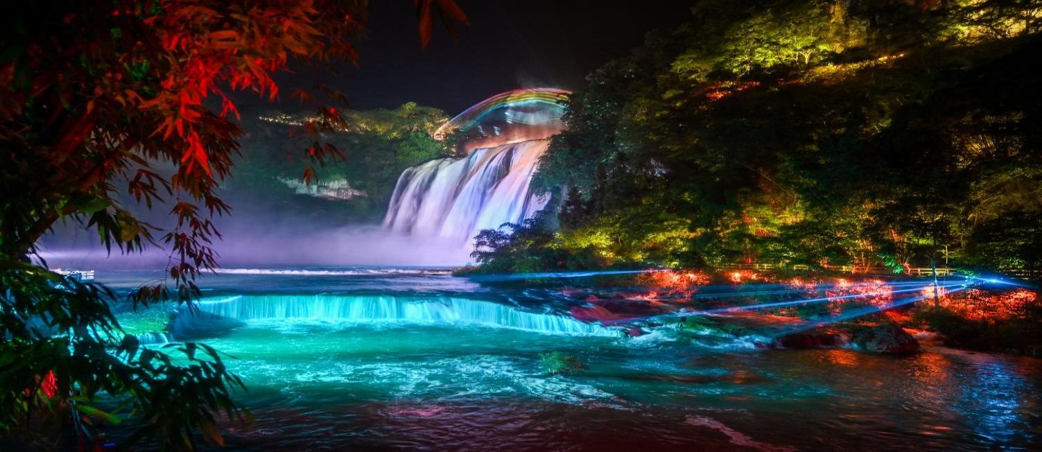 夜遊黃果樹大瀑布: 是國內首個以自然峽谷為載體的沉浸式光影夜遊體驗,融合科技與民族文化,為遊客呈現「此心安處是吾鄉」的奇幻之旅。