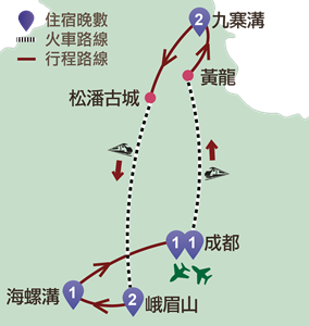 九寨溝、黃龍、松潘、峨眉山、樂山、海螺溝、成都