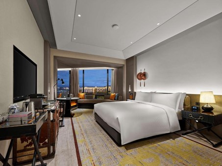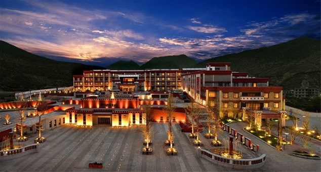 酒店由著名設計師Jean Michael Gathy操刀設計,以色拉寺為設計靈感,融合了現代元素的紅漆木製工藝,讓整個酒店充滿藏式風格。入住61平方米(約656呎)尊貴豪華客房,設有一般供氧和彌漫供氧設施。酒店的秀國際餐廳設有開放式互動廚房,供應全球各地美食;宴庭中餐廳裝飾典雅,提供正宗粵菜、川菜、湘菜和當地特色菜肴;六樓Tubo Bar夜景特別美,欣賞到西部純淨的天空,細細感受離天堂最近的地方的魅力。