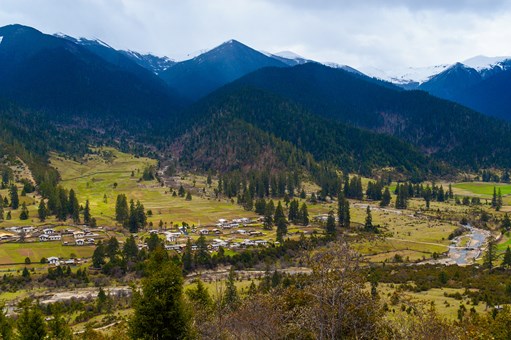 魯朗國際旅遊小鎮: 是一個被群山環抱的寧靜小鎮。鎮上的田園風光。遠處群山上雲霧繚繞,高山草甸上野花遍野。