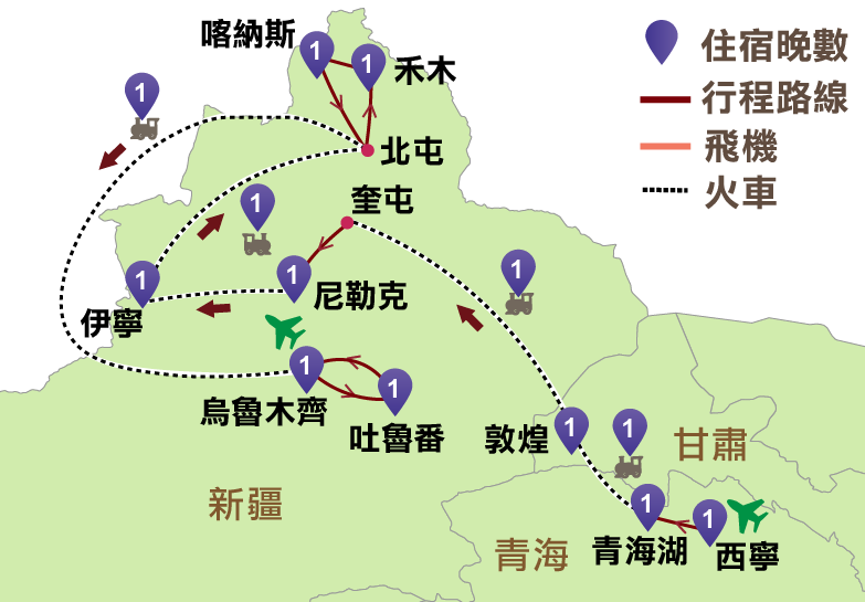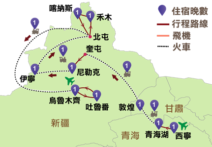 禾木、喀納斯、烏魯木齊、天山天池、吐魯番)