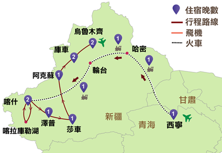 巴楚紅海胡楊林、阿克蘇、庫車、庫爾勒、博斯騰湖、天山勝利隧道、烏魯木齊、天山天池)