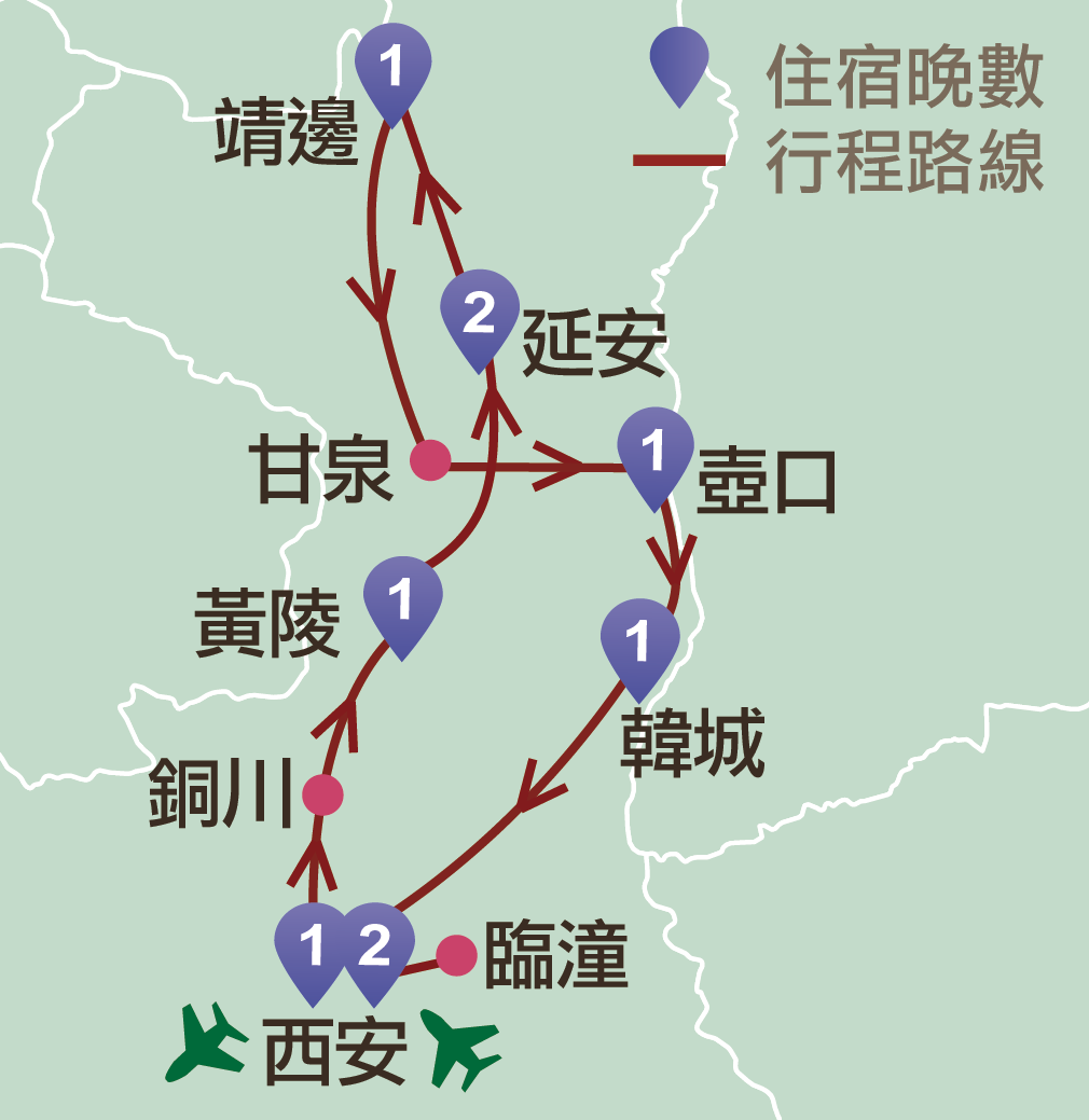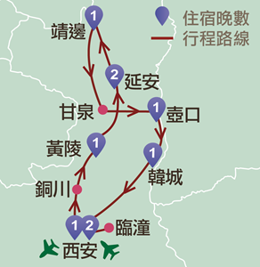 西安、銅川、黃陵、延安、靖邊、甘泉、壺口、韓城、臨潼