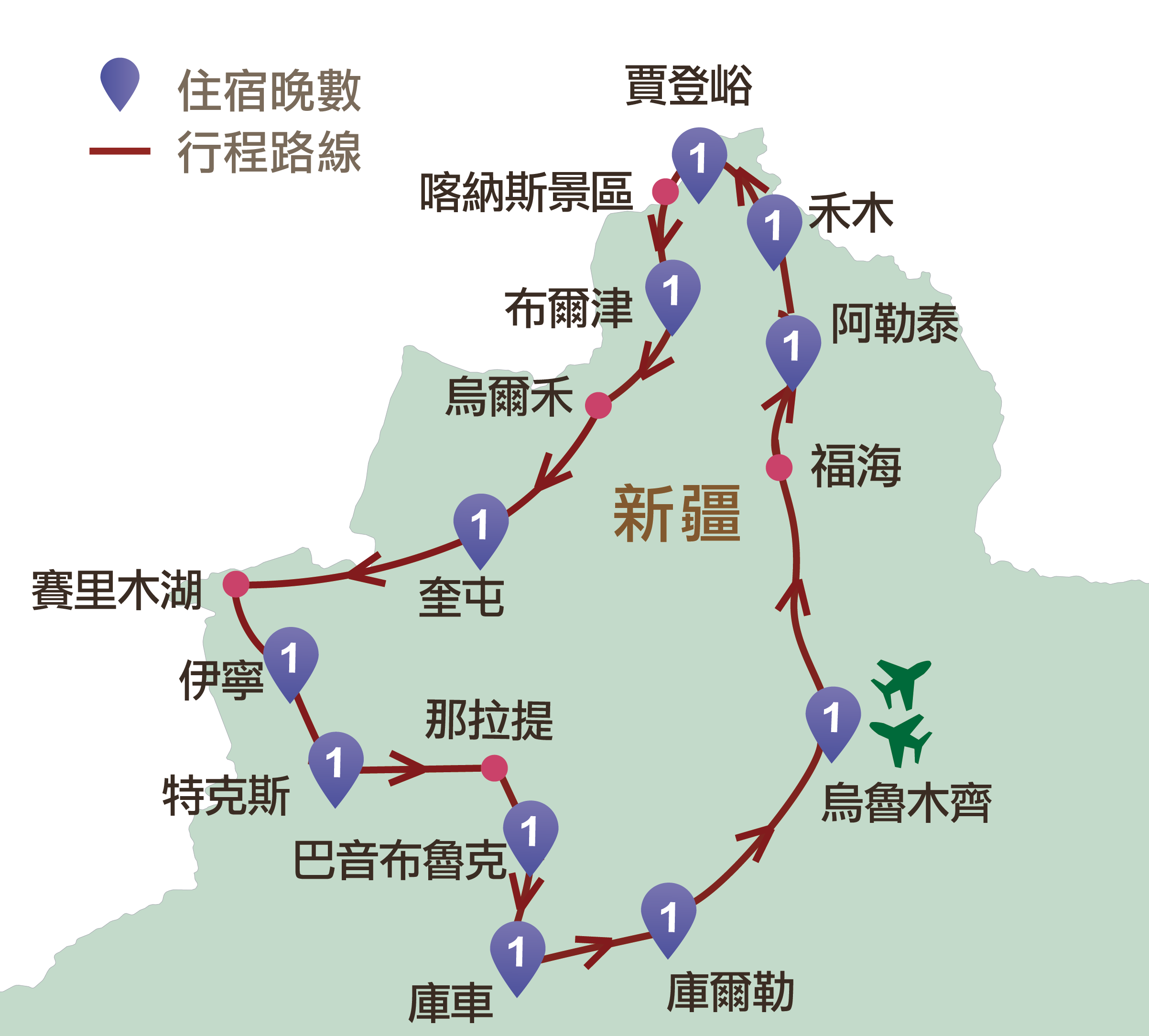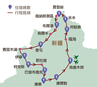 烏魯木齊、福海、阿勒泰、禾木、喀納斯、賈登峪、布爾津、烏爾禾、克拉瑪依、賽里木湖、果子溝、伊寧、天山花海、那拉提、獨庫公路、巴音布魯克、天山大峽谷、庫車、庫爾勒、博斯騰湖、天山勝利隧道
