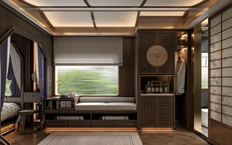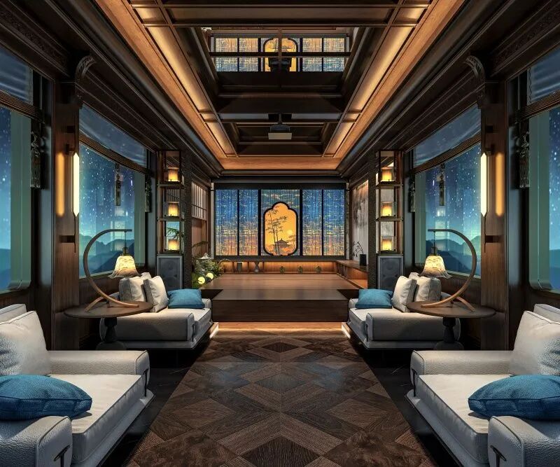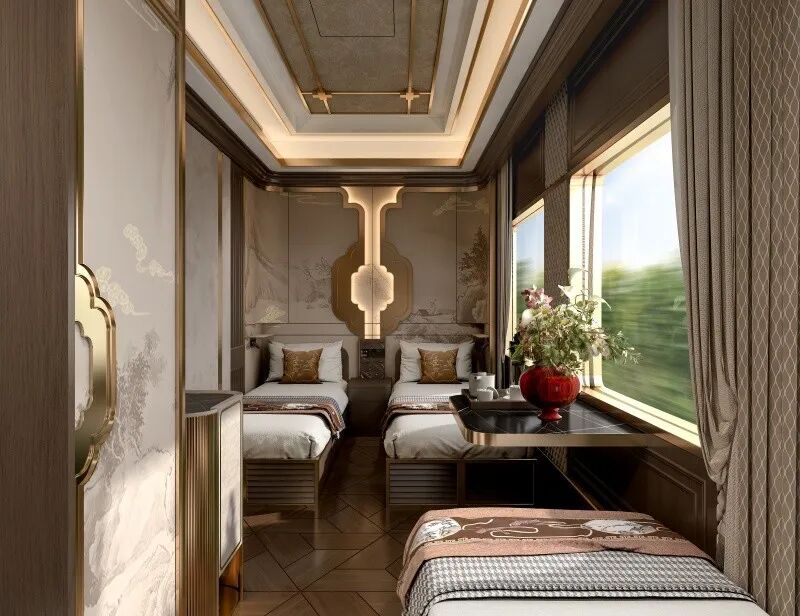 錦繡天府號列車的設計靈感源于巴蜀文化的“天・地、文・脈、生・活”三道哲學,以現代手法轉譯宋韻美學與蜀地符號,打造集自然、人文與生活美學於一體的“移動東方美學殿堂”。列車配備奢享與品質雙人房,均設獨立衛浴;多功能客廳車廂可靈活組合滿足宴聚、茶敘需求;觀景娛樂車廂融合手作、棋牌與觀景功能,提供多樣旅居樂趣。