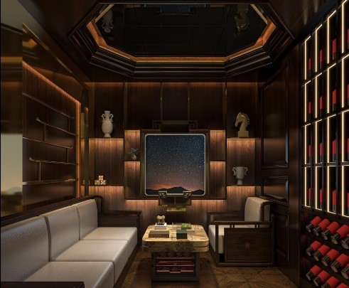 - 觀景廳(夜變迷你藝術舞台茶席收納燈光聚焦,投影巴蜀文化影像,支持民樂演出、旅客互動)