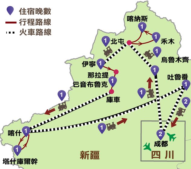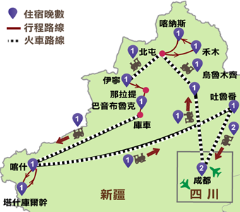 成都 、烏魯木齊、天山天池、北屯、禾木、喀納斯、伊寧、賽里木湖、那拉提、獨庫公路、巴音布魯克、
