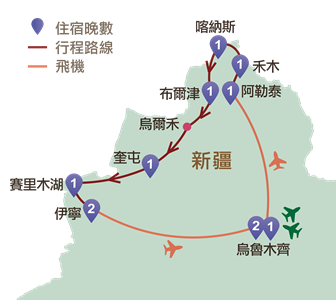 烏魯木齊、天池、阿勒泰、禾木村、喀納斯、布爾津、奎屯、賽裡木湖、霍爾果斯、惠遠古城、伊寧