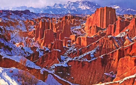 世界屋脊的冰雪秘境,總年積雪的慕士塔格峰巍峨聳立,喀拉庫勒冰面如鏡,塔吉克牧民的氈房點綴雪原,蒼茫純淨如神話之境。