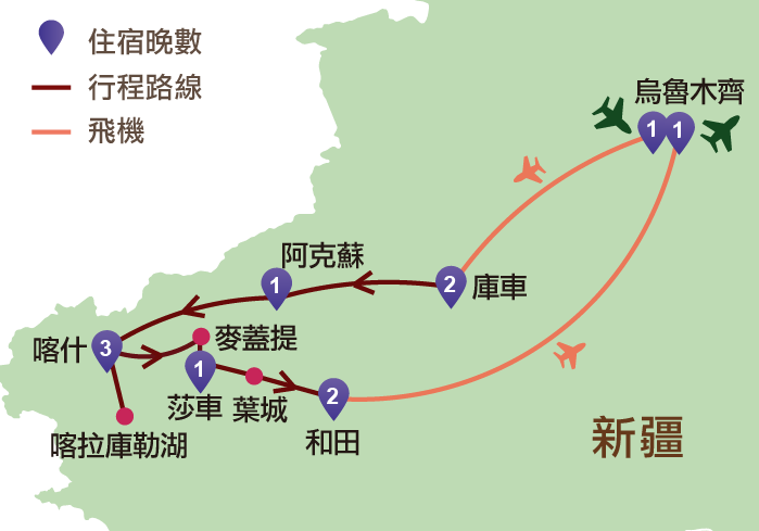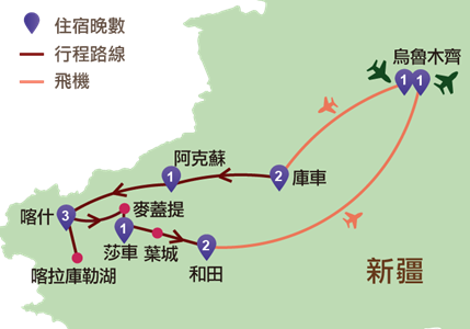 烏魯木齊、庫車、天山神秘大峽谷、阿克蘇、喀什、喀拉庫勒湖、帕米爾高原、麥蓋提、莎車、葉城、和田