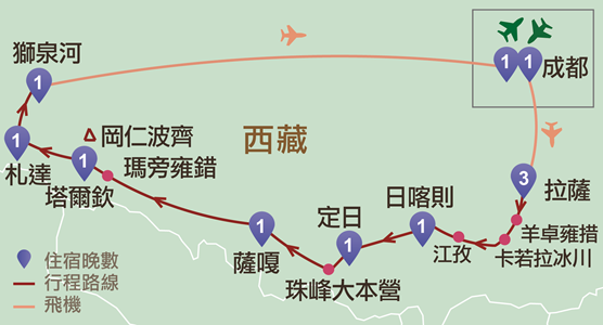 拉薩、羊卓雍措、江孜、日喀則、珠峰大本營、薩嘎、塔爾欽、阿里、札達、獅泉河、成都