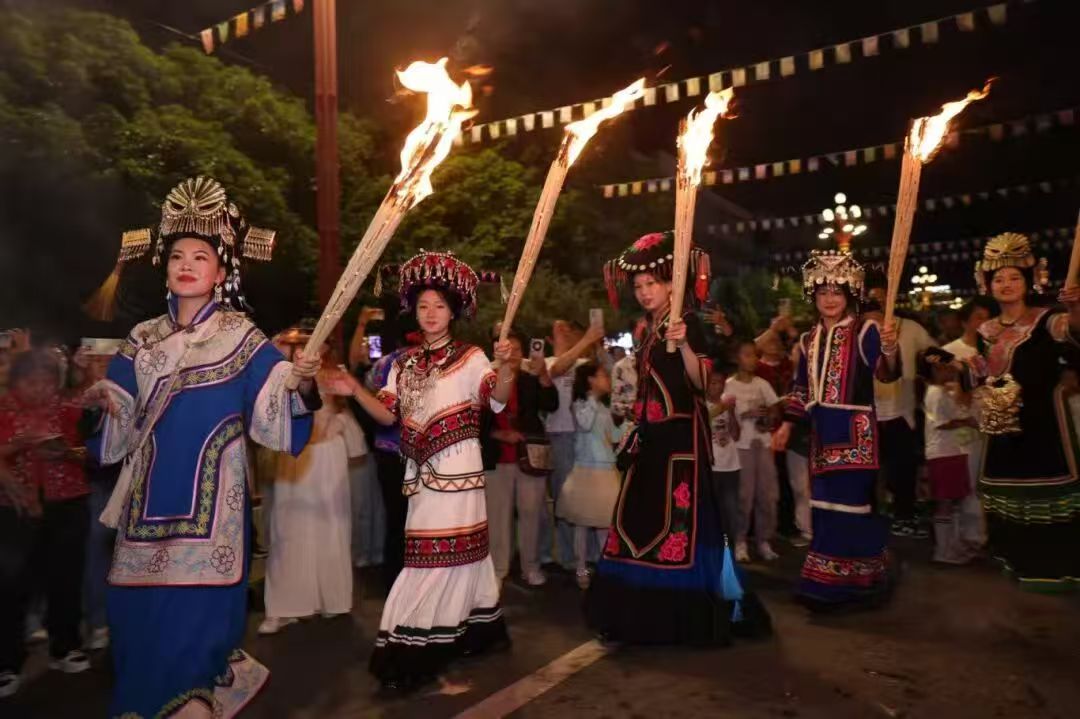 火把節祭火大典: 節日期間,成千上萬的火把點燃,照亮整個夜空,人們圍著篝火載歌載舞,跳著歡快的左腳舞,唱著嘹亮的彝族山歌,感受到彝族人民的熱情與豪邁。