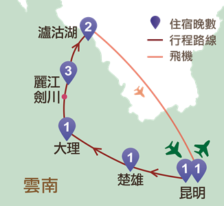 昆明、楚雄、大理、劍川、麗江、瀘沽湖