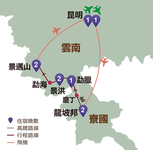 寮國︰龍坡邦、磨丁; 雲南西雙版納:磨憨、勐臘、景洪、勐海;普洱:景邁山