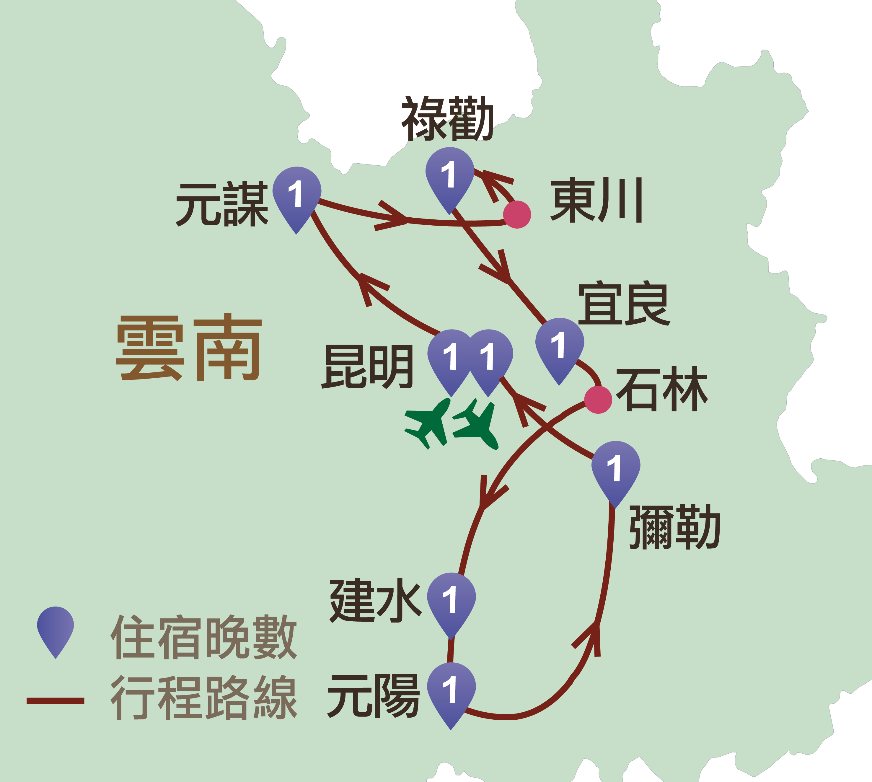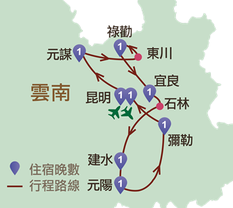 昆明、元謀、東川紅土地、轎子雪山、宜良、石林、建水、元陽、彌勒