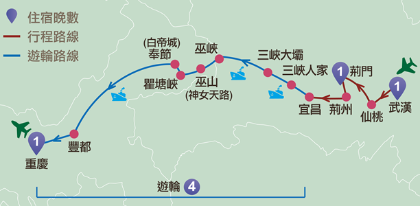 武漢、仙桃、荊門、宜昌、三峽大壩、三峽(巫峽、瞿塘峽)、巫山神女天路、奉節、豐都、重慶