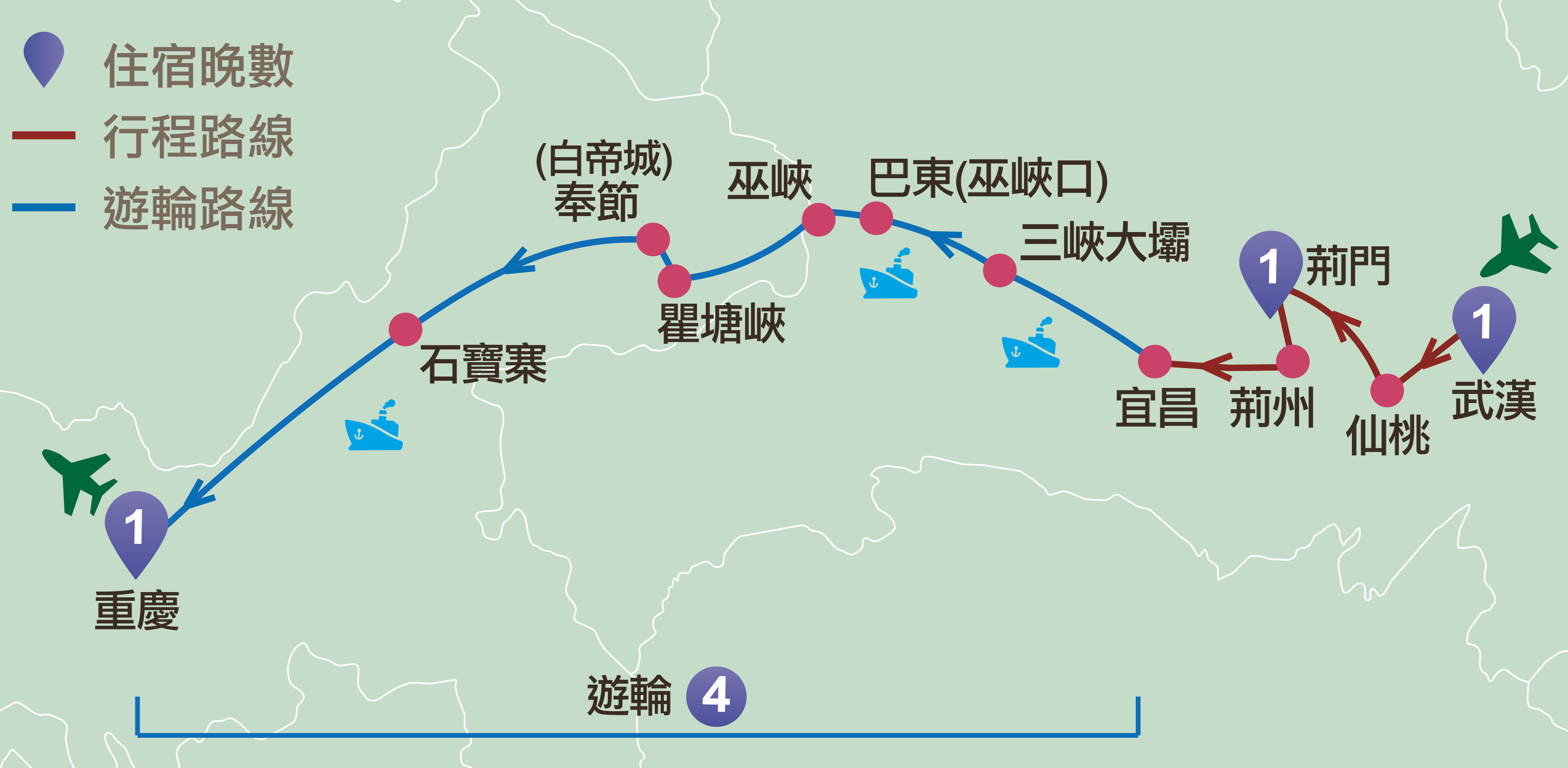 武漢、仙桃、荊門、荊州、宜昌、西陵峽、巴東、巫峽、瞿塘峽、奉節、白帝城、石寶寨、重慶、北碚