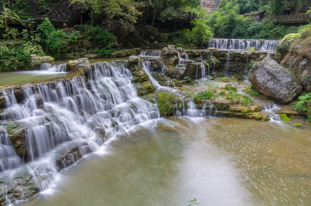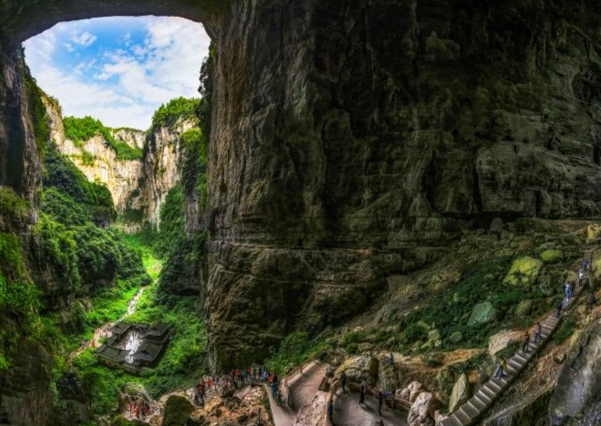 天生三橋景區: 罕見的地質奇觀,是電影《滿城盡帶黃金甲》和《變形金剛4》的取景地。乘坐觀光電梯下到谷底的天坑中,再沿著坑底幽靜的小道步行遊覽。此時環顧四周,有溪水流淌;抬頭仰望,都是懸崖萬丈,有山泉從上飛瀉而下,感受大自然的神奇和震撼。登上玻璃觀景台,為世上單塊面積最大的懸崖玻璃眺台,它建造在海拔1128米高的懸崖上,站在眺台上可將天生三橋美景盡收眼底。