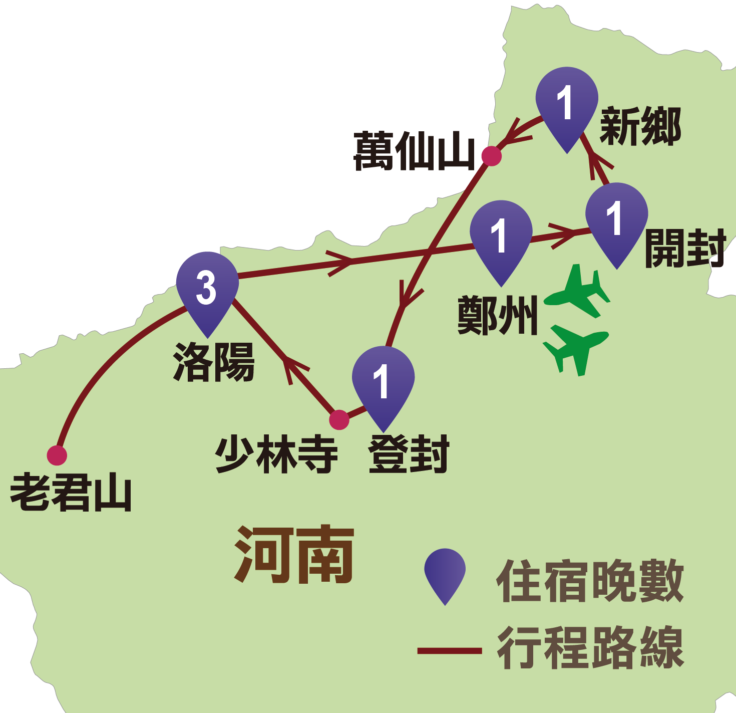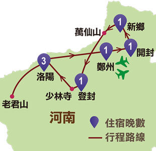 鄭州、開封、新鄉、萬仙山、郭亮村、登封、嵩山、少林寺、洛陽、欒川、老君山