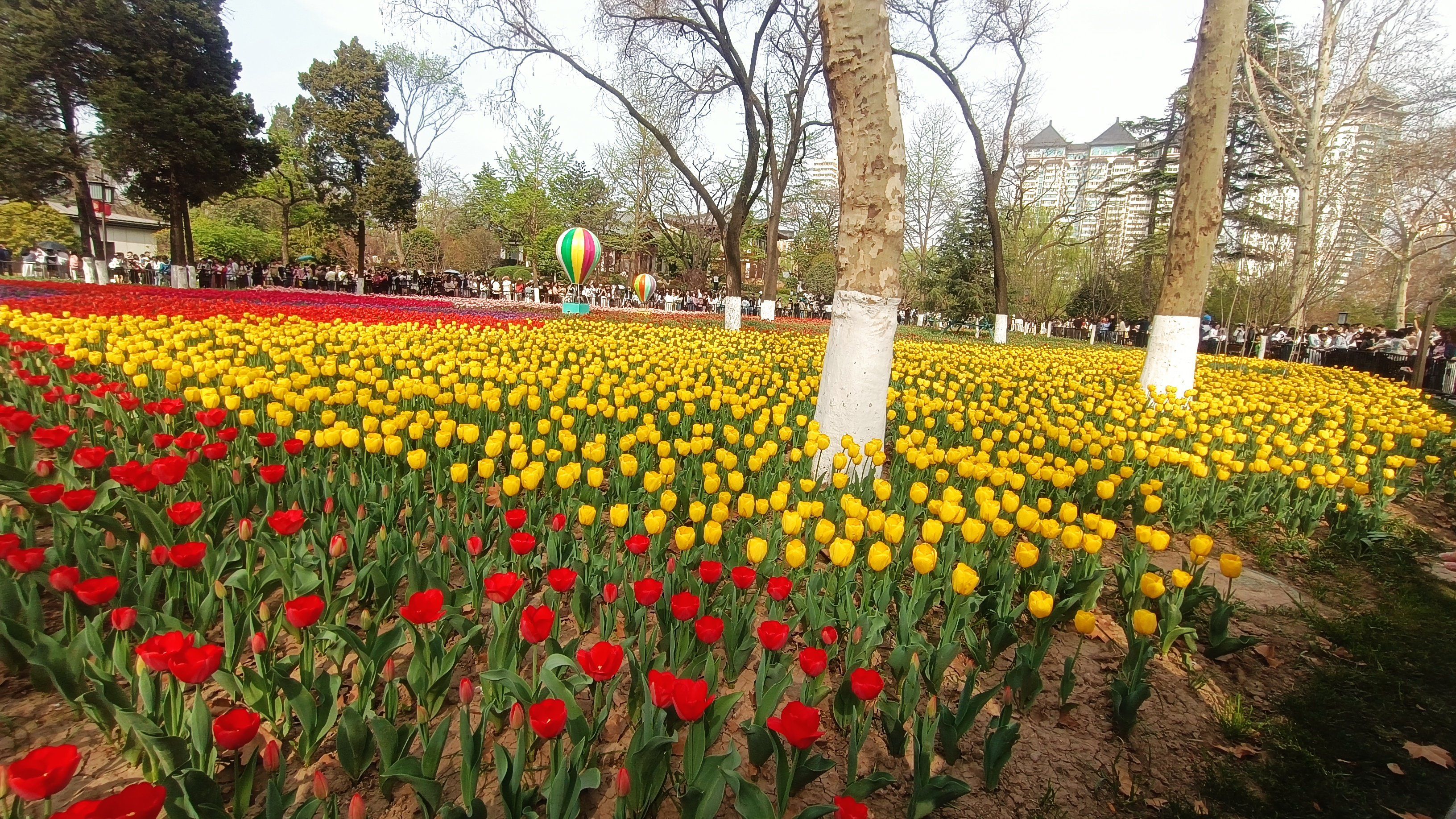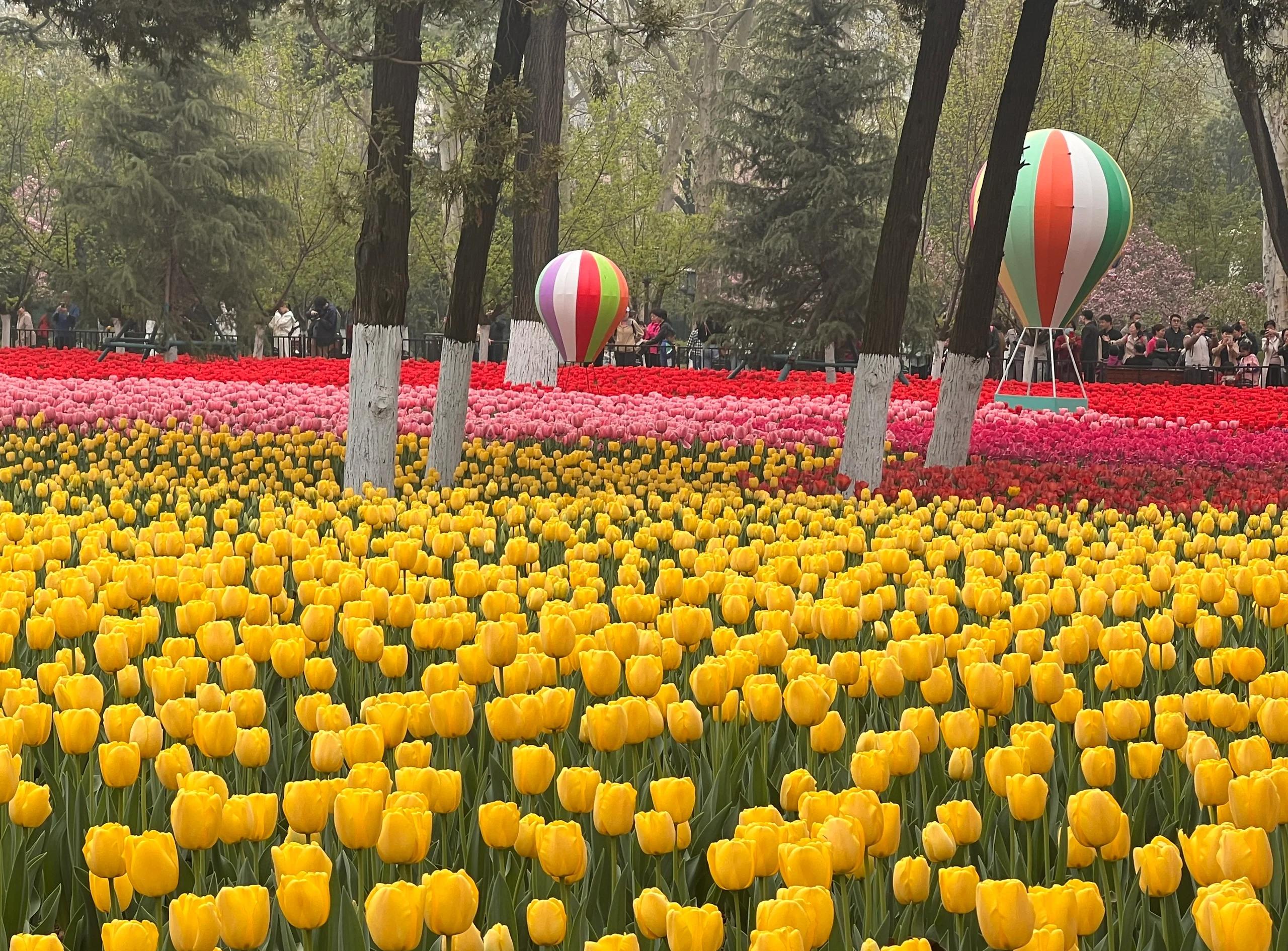 興慶宮: 20萬多株鬱金香競相綻放,五彩繽紛的花朵裝點著綠意盈盈的園區,構成了一幅絢爛多彩的春日畫卷。