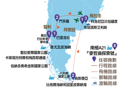 早餐後,專車前往郵輪碼頭,由領隊協助下辦理登船手續並登上南極21世紀『麥哲倫探索號』。