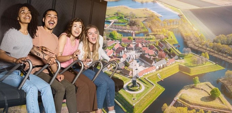 它使用球形屏幕和高質量的航拍鏡頭展示令人驚歎的視覺效果,呈現荷蘭鄉村和城市的迷人景色,融合風、霧、氣味等特效,打造逼真、引人入勝的飛行模擬,約8分鐘的飛行時間,慼受從未有過的嶄新感官體驗。