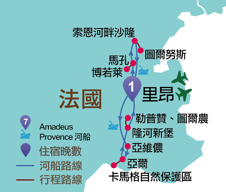 法國:里昂、馬孔、博若萊、索恩河畔沙隆、圖爾努斯、亞維農、亞爾、卡馬格自然保護區、隆河新堡、勒普贊、圖爾農