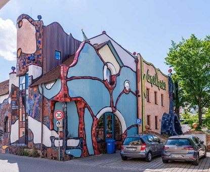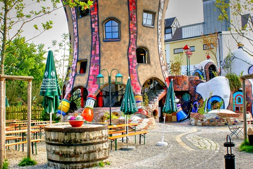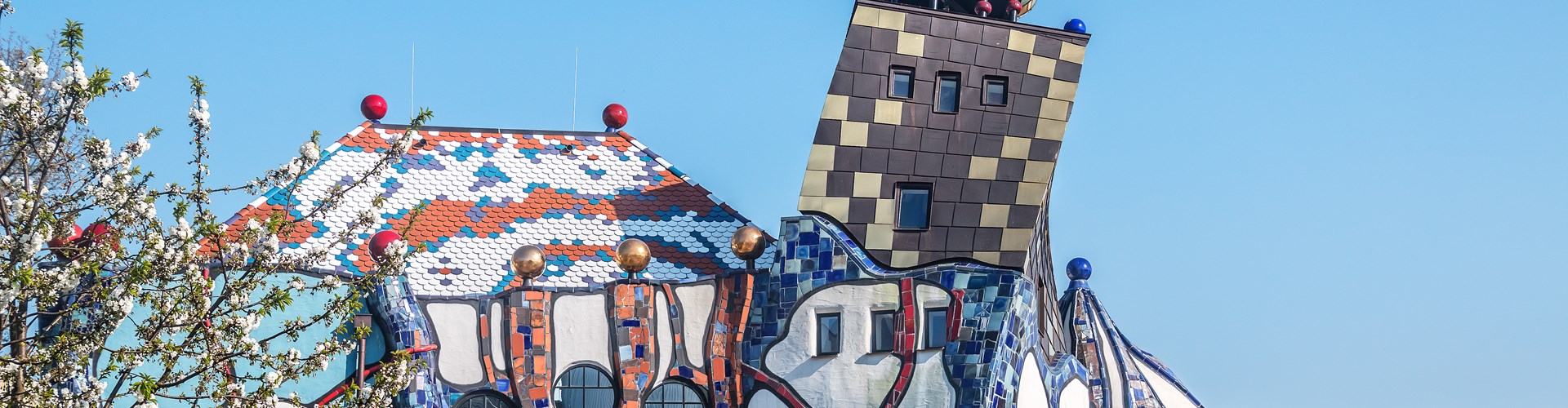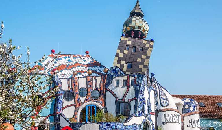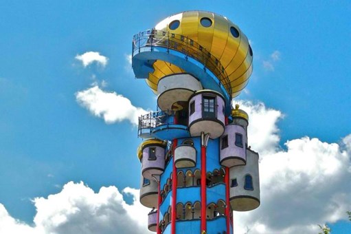 斜塔以波浪形屋頂和色彩斑斕的外牆而聞名,設計不僅美觀,還能有效地收集雨水並促進生態平衡。整個藝術中心採用可再生材料建造,並設有綠化屋頂和花園,能夠在欣賞藝術的同時,也感受到大自然的氣息。裡面展覽了許多百水先生的繪畫真跡作品、生前所用過的工作室用品以及生前留下來的相片。