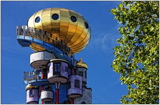可以看到非常具有百水先生的建築風格:背離稜角;善用圓形、凹凸不平的地板、有機線條、馬賽克式的陶瓷和磁磚、洋蔥屋頂、綠色屋頂, 而這些特色都是百水先生認為是能與自然更和諧的人性化建築典型元素。