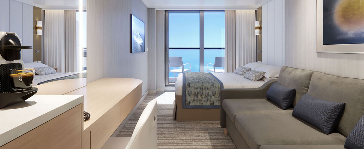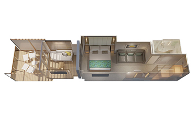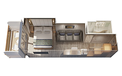 全新設計度假風格客艙,欣賞壯麗景觀。小屋迷你套房艙設有露台、私人小屋、獨特的戶外設備和超大的私人起居空間,讓人可以享受清新海風。設有梳化床的獨立休憩區和優質沐浴用品,好好放鬆身心。