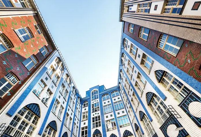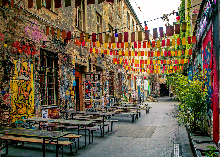 哈克雪庭院誕生於1906年,在已經工業化及都市化的當時,這棟建築物是首創的摩登集合住宅形式,傳遞著「向更好的居住空間致敬」建築理念。德文裡的Höfe等於英文裡的courtyard,意指中庭或庭院,是柏林特有建築形式,住宅以ㄇ或口字形建構,中間為庭園,確保每間公寓、每一面都有著良好採光。哈克雪庭院裡頭一共有八棟不同尺寸大小的庭園建築(Höfe),皆為五層樓高,每個中庭都有花園、綠地或噴水池,相互連結,創造出和諧的、結合住宅、休閒空間,工匠職人工作室及小規模生意的生活空間。