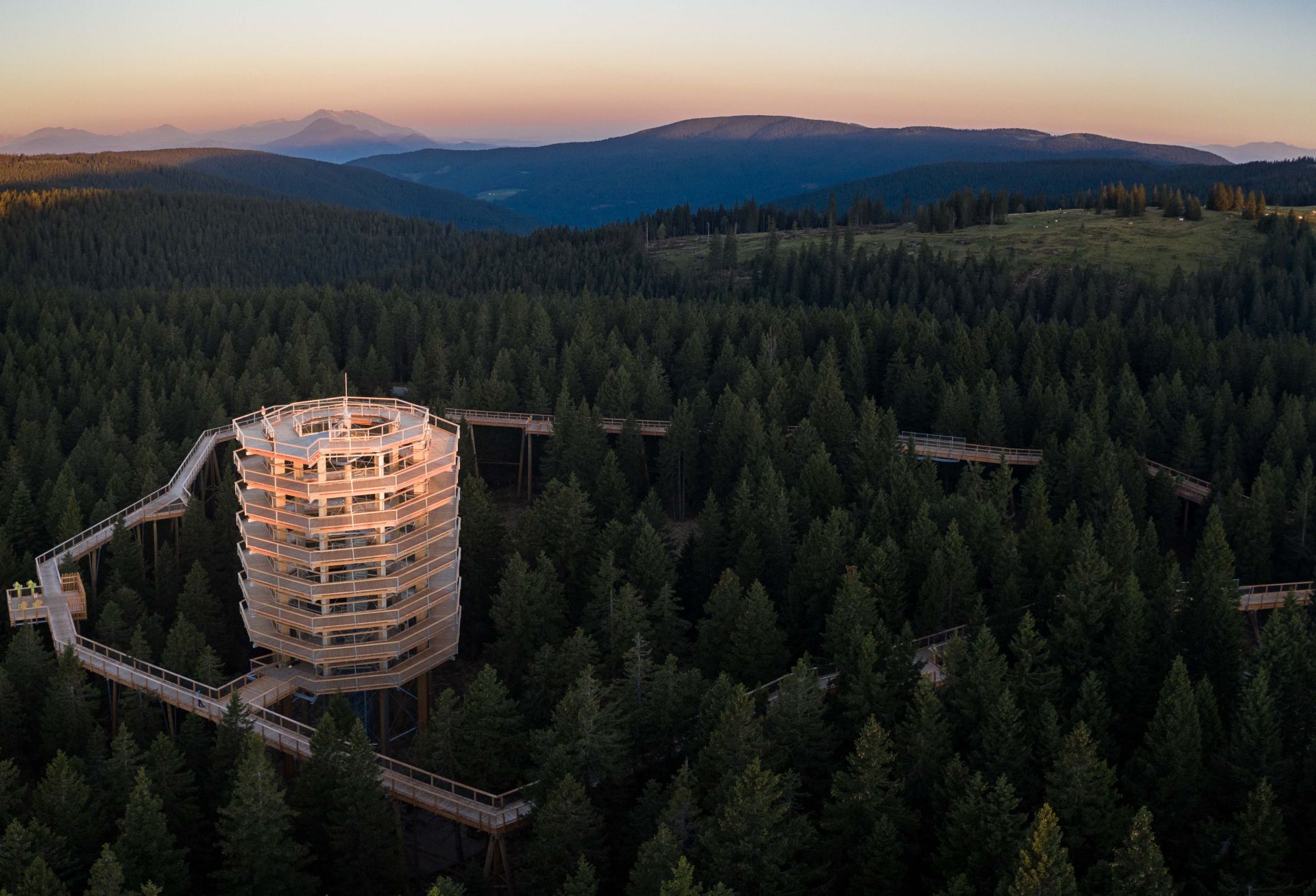 空中步道坐落於波霍列山脈的心臟地帶,海拔1517米的羅格拉山頂。全長1043米的步道穿梭於原始森林的樹冠之間,呈現斯洛文尼亞最珍貴的自然瑰寶。