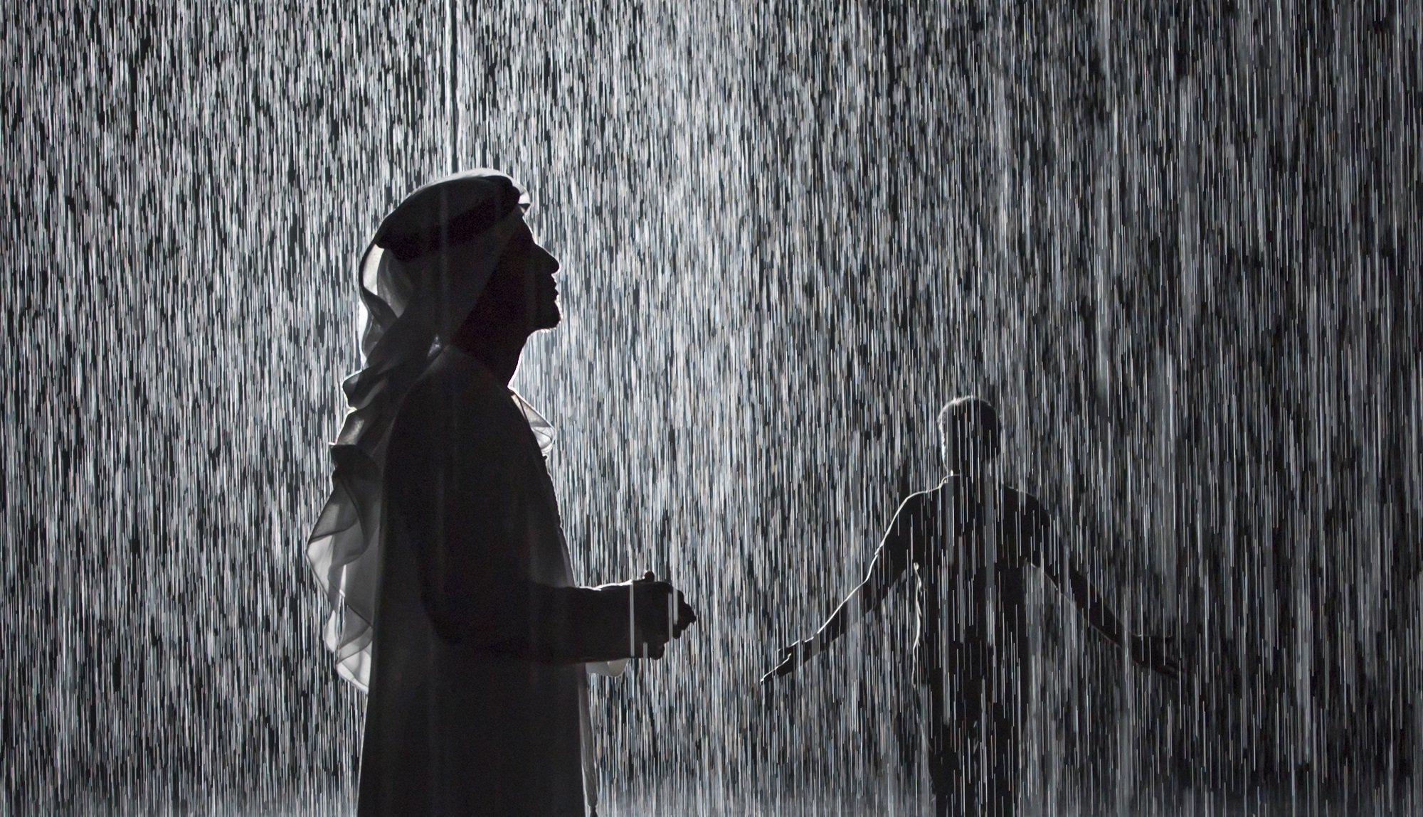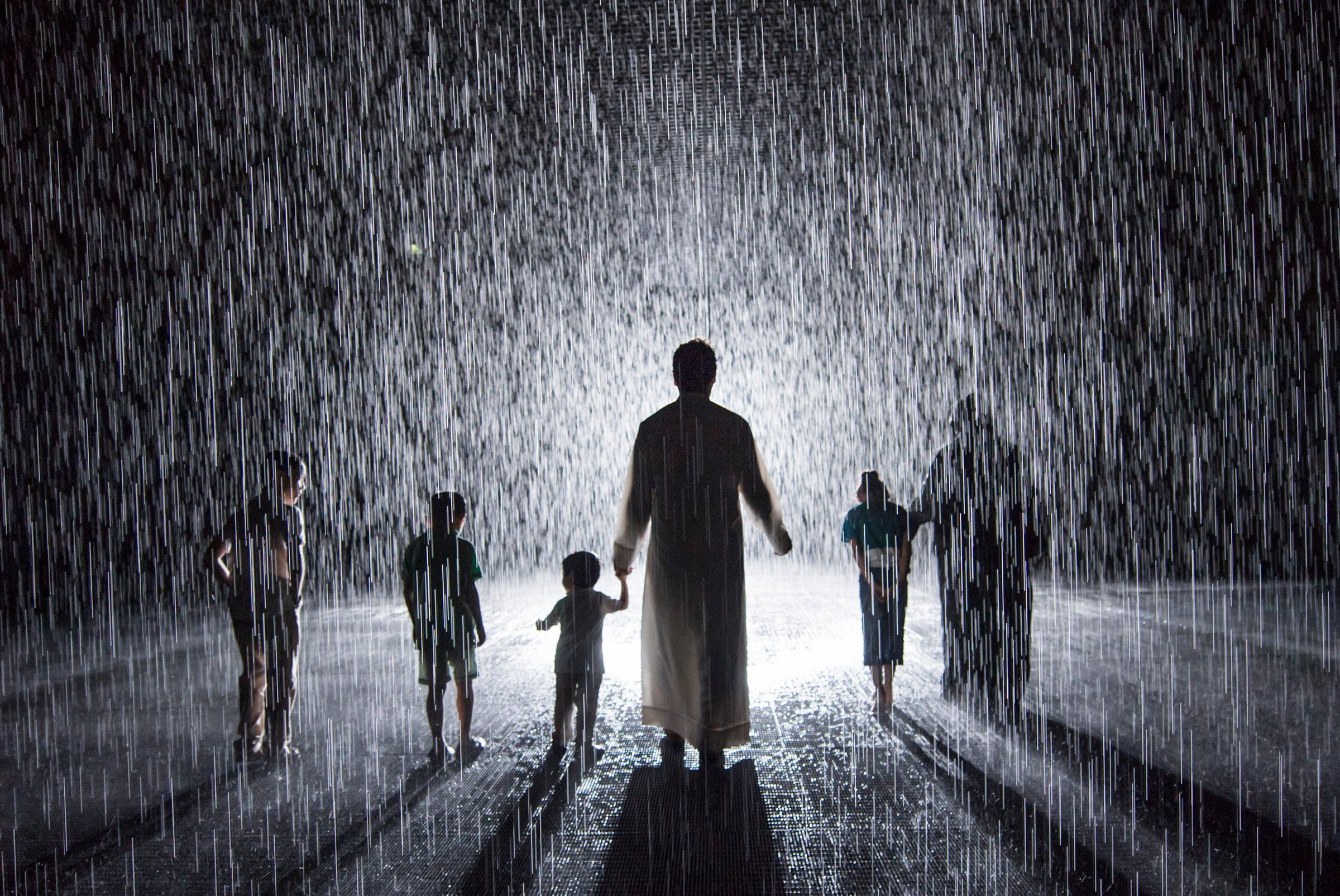 這是一件由 Random International 創作的互動裝置藝術作品,讓觀眾在一個充滿雨水的空間中,體驗在雨中漫步卻不被淋濕的奇妙體驗。