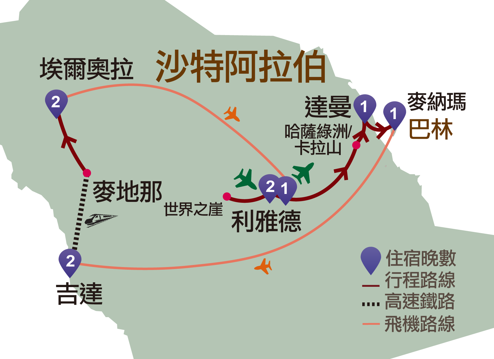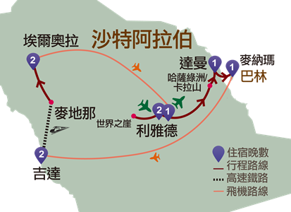 沙特阿拉伯︰利雅德、世界之崖、達曼、哈薩綠洲、吉達、麥地那、埃爾奧拉(黑拉格、馬拉亞音樂廳、大象岩)
