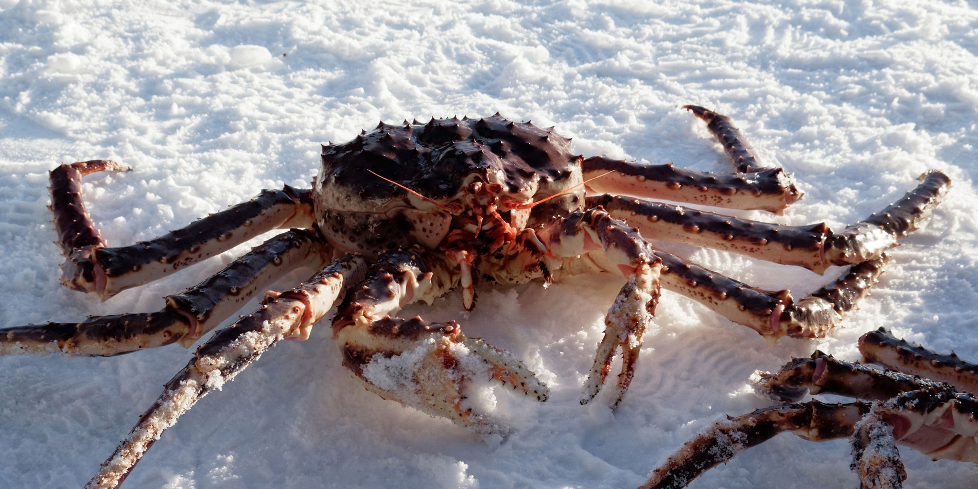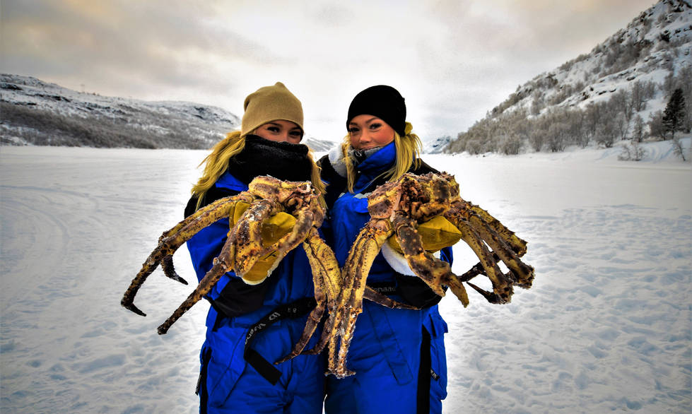特別安排乘坐雪上電單車拉雪橇前往結冰的峽灣,到事先勘察的冰洞旁,由專人講解及即席將捕蟹籃從洞內拉出, 團友更有機會親手拿獲體型龐大的帝王蟹拍照留念! 乘雪橇返回木屋後,品嚐肉質鮮美的帝皇蟹。(提供保暖衣物)