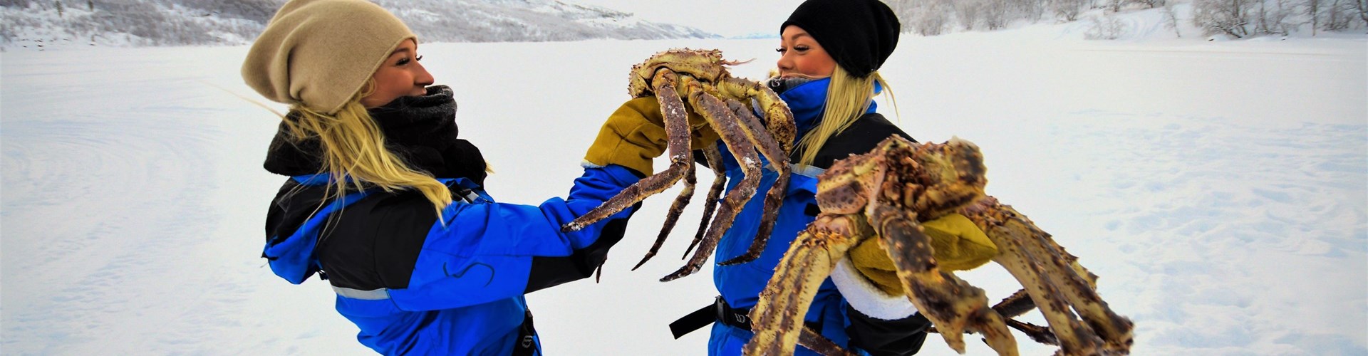 特別安排乘坐雪上電單車拉雪橇前往結冰的峽灣,到事先勘察的冰洞旁,由專人講解及即席將捕蟹籃從洞內拉出,團友更有機會親手拿獲體型龐大的帝王蟹拍照留念!乘雪橇返回木屋後,品嚐肉質鮮美帝皇蟹。(提供保暖衣物)