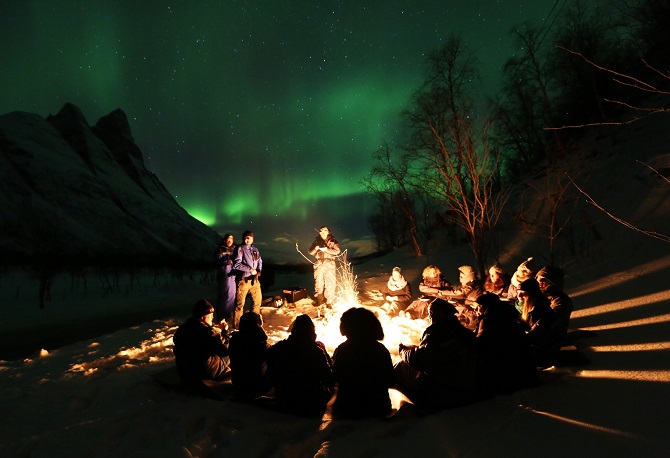 走進遠離光害的環境中,追蹤如夢似幻北極光外,更可透過解說了解北極光的傳說與資料。在溫暖營火會中享用熱飲及小吃,窩心貼心。